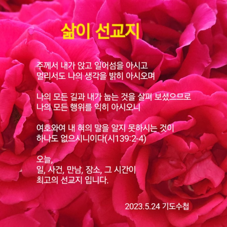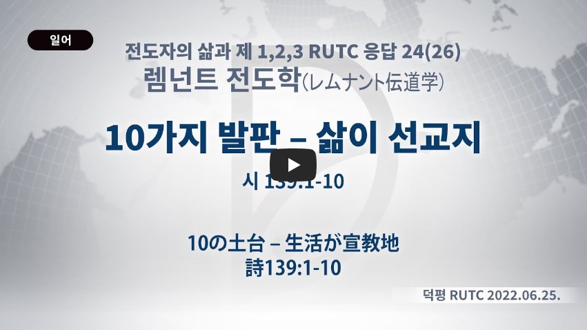 2023년 5월 24일 (수) 분류 렘넌트전도학(2022-제123RUTC응답24)- 26 제목 10가지 발판- 삶이 선교지 성경 시편 139:1-10 일시/장소 2022년 6월 25일, 덕평RUTC 설교 류광수 목사 (녹취정리: 차동호 목사) 출처 (