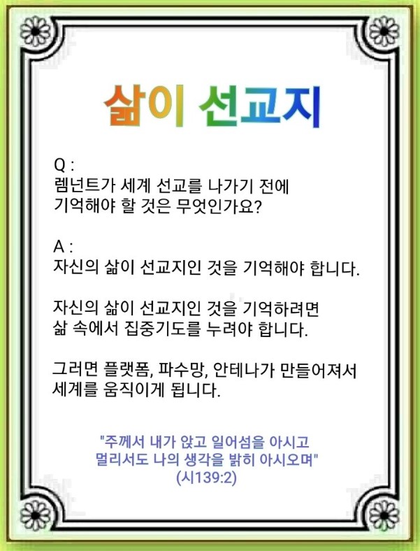 렘넌트는 세계 선교를 나가기 전에 자신의 삶이 선교지인 것을 기억해야 합니다. 후진국의 종교들은 주문, 주술로 많은 영향을 주고 있고, 3단체는 계속 반복하는 기도를 합니다. 복음이 진리이지만 실제 방법에서는 지고 있습니다. 렘넌트들이 삶 속에서 집중 기도를 누려야 세계를 움직일 수 있습니다. 다윗과 렘넌트 7명은 어떻게 기도했을까요?