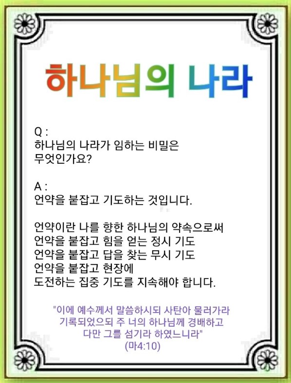 기도는 사람 앞에서 하는 것이 아니라 하나님 앞에서 하는 것입니다. 그 기도는 반드시 응답 됩니다. 예수께서는 주기도문을 가르치셨는데 그 Key는 하나님 나라와 그 의를 구하는 것입니다. 바울은 성령 인도 받기 위해, 예수께서는 사탄의 일을 꺾으시려고 금식 기도를 하셨습니다.