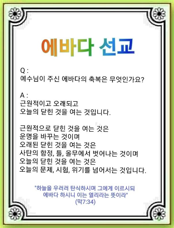 아무리 언약과 축복이 와 있어도 오늘의 닫힌 것을 열지 않으면 안 됩니다. 그리스도께서 “에바다!”라고 말씀하시는 순간에 성취된 것입니다. 우리는 모든 문제, 시험, 위기를 다 넘어선 증인으로(막 7:36) 하나님의 계획인 미래의 문을(막 7:37) 열어야 됩니다.