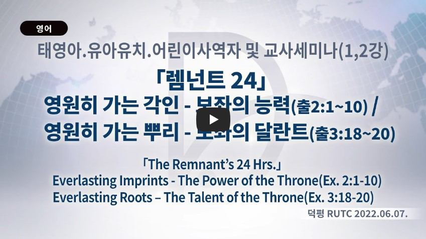 2023년 6월 1일 (목) 분류 2022- 렘넌트사역자/교사 세미나(영유아초등) 제목 1과: 렘넌트24-영원히 가는 각인-보좌의 능력 성경 일시/장소 2022년 6월 7일, 덕평RUTC 설교 류광수 목사 (녹취정리: 차동호