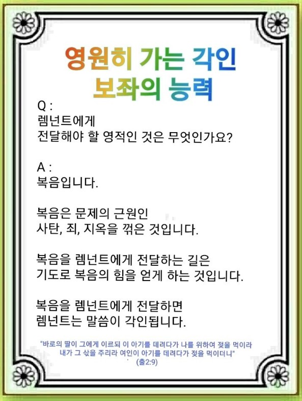 렘넌트에게 영적인 것을 바르게 각인시켜야 합니다. 3단체가 명상운동을 통해서 세계를 장악했습니다. 그리고 영적으로 틀린 것을 각인시키고 있습니다. 이것을 능가할 수 있는 것은 복음밖에 없습니다. 우리는 기도로 영적인 것을 바르게 전달해 줄 수 있습니다. 그리고 우리의 말과 복음이 일치할 때 렘넌트에게 영적인 것이 전달됩니다.