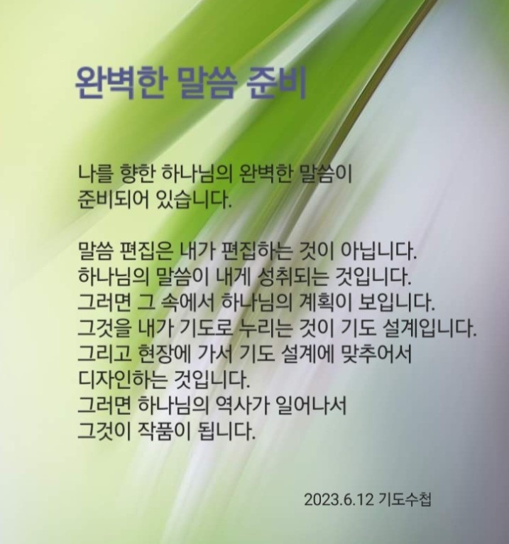 말씀 편집, 기도 설계, 현장 디자인을 하는 것은 중요합니다. 말씀 편집은 내가 편집하는 것이 아닙니다. 하나님의 말씀이 내게 성취되는 것입니다. 그러면 그 속에서 하나님의 계획이 보입니다. 그것을 내가 기도로 누리는 것이 기도 설계입니다. 그리고 현장에 가서 기도 설계에 맞추어서 디자인하는 것입니다. 그러면 하나님의 역사가 일어나서 그것이 작품이 됩니다.