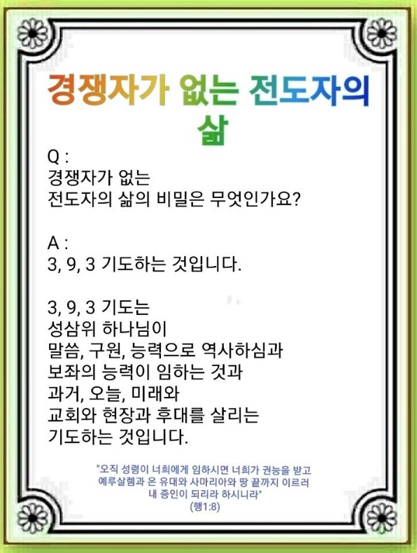 실제로 전도자에게는 경쟁자가 없습니다. 예수께서 “오직, 이 능력을 받으면 땅끝까지 증인이 되리라.”라고 하셨습니다. 우리는 3·9·3 기도를 평소에 늘 해야 됩니다. 공부를 해야 하는 렘넌트는 3·9·3을 받아들이는 기도를 하시기 바랍니다. 우울증 또는 영적인 병이 있거나 나이 드신 분들도 호흡하면서 기도해 보시기 바랍니다. 이때 7대 여정을 하루 한 개씩 깊이 기도해 볼 필요가 있습니다. 이러면 자신이 전무후무한 사람임을 알게 되고, 이때부터 하나님이 만드신 나, 나의 것, 나의 현장이 보이게 됩니다. 이때부터 굉장한 응답들이 일어나기 시작합니다. 그중에 가장 중요한 삶 *21가지가 나옵니다. 이것을 어떻게 누릴 수 있을까요?