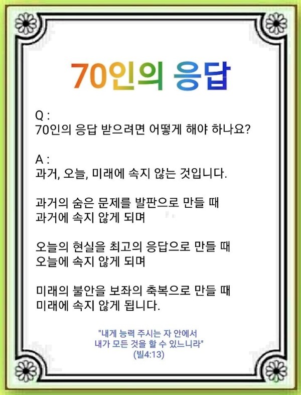 세 가지를 놓치면 아무리 열심히 해도 소용없습니다. 그것은 과거, 오늘, 미래입니다. 70인 응답을 받으려면 과거의 숨은 문제, 오늘의 현실, 미래의 불안에 속으면 안 됩니다. 어떻게 해야 속지 않을 수 있을까요?