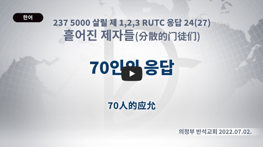 2023년 6월 15일 (목) 분류 흩어진 제자들(2022-제123RUTC응답24)- 27 제목 70인의 응답 성경 일시/장소 2022년 7월 2일, 의정부 반석교회 설교 류광수 목사 (녹취정리: 차동호 목사) 출처 (사)세계복음화전