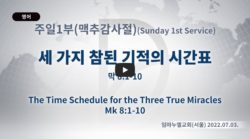 2023년 6월 17일 (토) 분류 주일예배 설교- 주일1부(맥추감사절) 제목 세가지 참된 기적의 시간표 성경 마가복음 8:1-10 일시/장소 2022년 7월 3일, 임마누엘교회(서울) 설교 류광수 목사 (녹취정리: 차