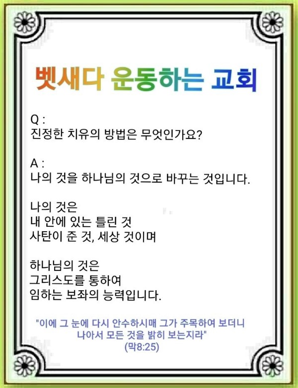 마가복음 8:22-26 / 이에 그 눈에 다시 안수하시매 그가 주목하여 보더니 나아서 모든 것을 밝히 보는지라 (25)