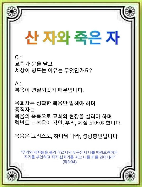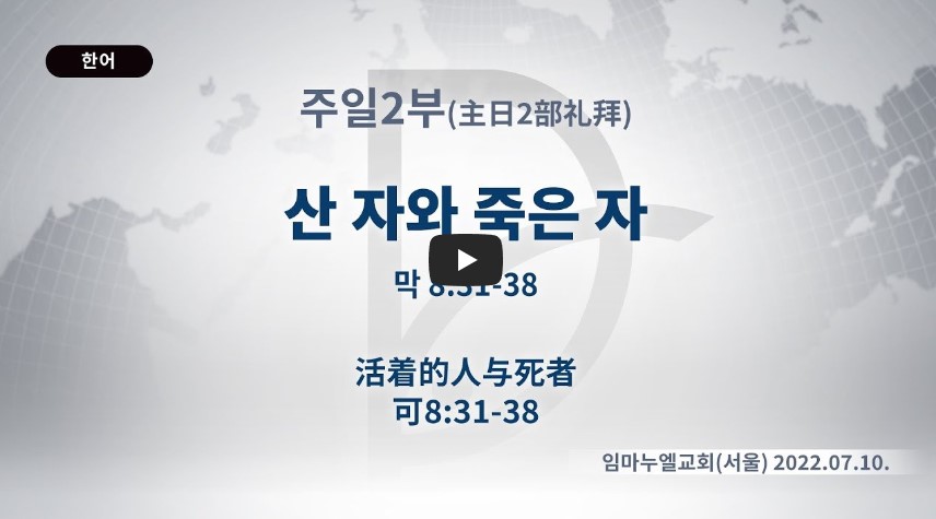 2023년 6월 27일 (화) 분류 주일예배 설교- 주일2부 제목 산 자와 죽은 자 성경 마가복음 8:31-38 일시/장소 2022년 7월 10일, 임마누엘교회(부산) 설교 류광수 목사 (녹취정리: 차동호 목사) 출처 (사)