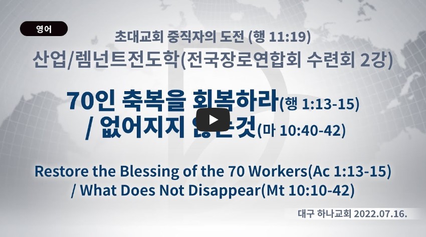 2023년 6월 28일 (수) 분류 산업선교(2022-제123RUTC응답24)- 전국장로연합회 수련회 제목 2강: 70인 축복을 회복하라 성경 사도행전 1:13-15 일시/장소 2022년 7월 16일, 대구 하나교회 설교 류광수 목사 (