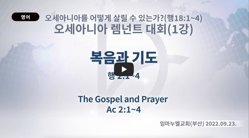 2023년 7월 1일 (토) 분류 2022- 오세아니아 렘넌트대회 제목 1강: 복음과 기도 성경 사도행전 2:1-4 일시/장소 2022년 9월 28일-29일, 237센터(온라인) 설교 류광수 목사 (녹취정리: 차동호 목사) 출처 (사