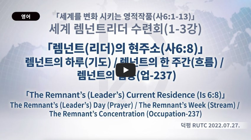 인터넷총국 (홈페이지 http://data.rutc.com) 후원: (국민은행) 856701-04-233309 (사)세계복음화전도협회 인터넷총국 분류 2022- 세계 렘넌트 리더수련회 제목 1강의: 렘넌트의 하루+렘넌트의 한주간+렘넌트
