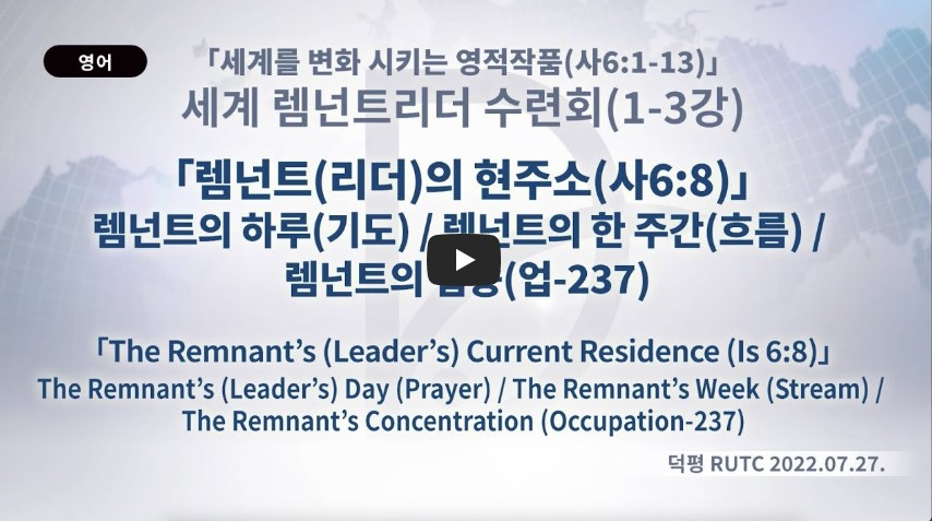 이사야가 주의 목소리를 들을 정도로 집중했습니다. 이것이 렘넌트가 해야 할 집중의 기준입니다.(사 6:8) 사 6:10-12에 들어도 듣지 못하고, 보아도 보지 못할 것이다.”라고 말씀하셨습니다. 렘넌트가 이 집중을 하게 되면 그 누구도 듣지도 보지도 못하는 것을, 듣고 보게 됩니다. 그러면 경쟁자가 있을 수 없습니다. 마지막으로 여러분은 그루터기입니다. 그루터기에서 새싹이 나오고, 이 새싹이 나무가 되고, 숲이 되어 모든 생명을 살리게 됩니다. 이것이 우리의 집중의 이유이자 기준입니다.