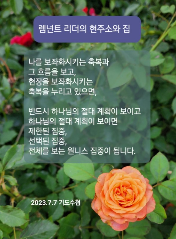 하나님의 절대 계획을 잡고 집중하는 것입니다. 나를 보좌화시키는 축복과 그 흐름을 보고, 현장을 보좌화시키는 축복을 누리고 있으면, 반드시 하나님의 절대 계획이 보입니다. 하나님의 절대 계획이 보이면 제한된 집중, 선택된 집중, 전체를 보는 원니스 집중이 됩니다.