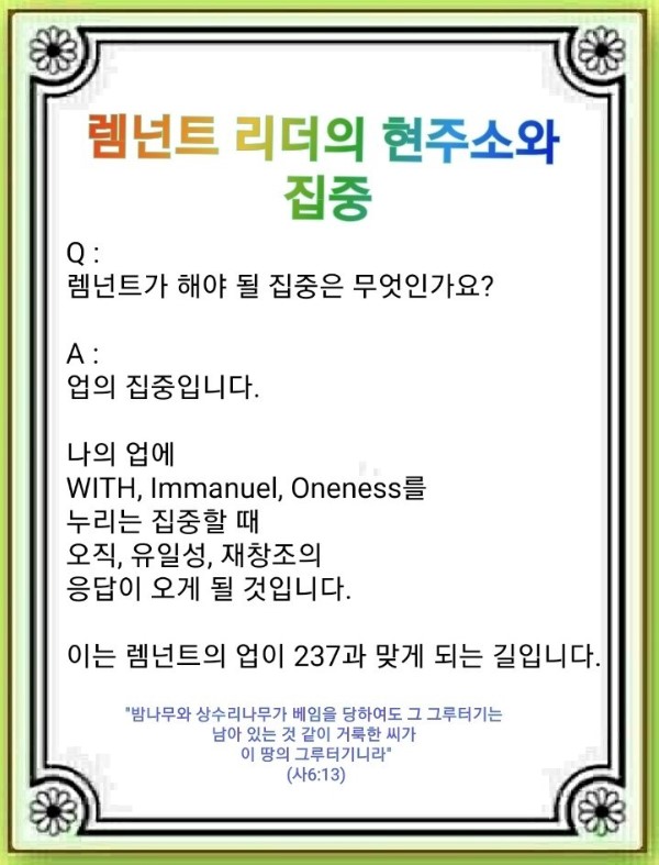 나의 업을 가지고 WITH, Immanuel, Oneness를 누리면 됩니다. 그리고 오직, 유일성, 재창조의 응답이 올 만큼 집중하면 됩니다. 이것이 업의 기준입니다. 이렇게 집중하는 가운데 나의 업이 237과 맞게 되면 반드시 승리하게 됩니다.