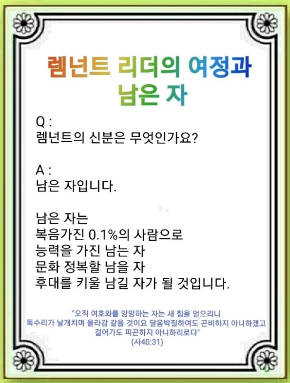 남은 자는 0.1%의 사람입니다. 하나님은 렘넌트에게 새 힘을 주어서 '남는자', 문화권 정복할 '남을 자', 전 세계 후대를 키울 '남길 자'로 만드실 것입니다. 이것이 렘넌트의 신분입니다.