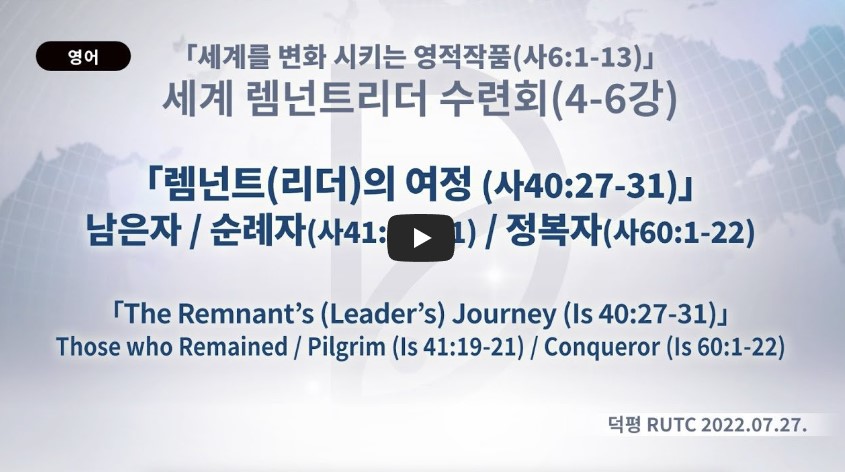 ♠ 4강 녹취: 렘넌트(리더)의 여정→ 남은 자(사40:27-31) ♠ ♠서론: 4-6강(렘넌트의 여정)→ 남은 자(사40:27-31)+순례자(사41:19-21)+정복자(사60:1-22) ▶감사합니다. 여러분이 기도가 잘 안 되어지죠? 또