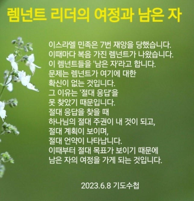 이스라엘 민족은 7번 재앙을 당했습니다. 복음을 누리지 못하고 전하지도 않았기 때문에 당연한 일이었습니다. 그 이스라엘 백성 중에서 복음 가진 렘넌트가 나왔습니다. 0.1%도 안 되는 소수였지만 어떤 강대국도 이 렘넌트들을 없애지 못했습니다. 이 렘넌트들을 '남은 자'라고 합니다. 문제는 렘넌트가 여기에 대한 확신이 없는 것입니다. 그 이유는 '절대 응답'을 못 찾았기 때문입니다. 절대 응답을 찾을 때 하나님의 절대 주권이 내 것이 되고, 절대 계획이 보이며, 절대 언약이 나타납니다. 이때부터 절대 목표가 보이기 때문에남은 자의 여정을 가게 되는 것입니다.
