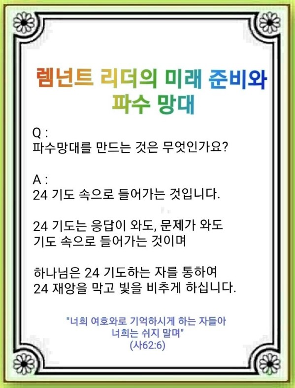 어려움을 만나도, 응답이 와도, 심지어 실수와 잘못을 해도 24 기도 속으로 들어가야 합니다. 이것이 파수 망대를 만드는 것입니다. 24 하라는 것은 파수꾼이 되라는 것입니다. 렘넌트가 기도할 수 있다면 세계를 움직이는 파수꾼이 됩니다. 파수꾼은 24 빛을 밝혀서 24 재앙을 막는 것입니다. 일이 있든 없든 24 지키는 자입니다. 파수꾼의 축복을 누리는 기도는 모든 것을 편안하게 하고, 행복하게 하며, 능력을 줍니다.