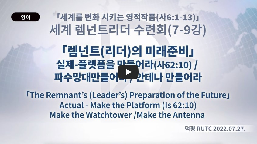 2023년 7월 13일 (목) 분류 2022- 세계 렘넌트 리더수련회 제목 3강의: 실제 플랫폼+파수망대+안테나를 만들어라. 성경 이사야 62:6-12 일시/장소 2022년 7월 27일-28일, 덕평RUTC 설교 류광수 목사 (녹취정