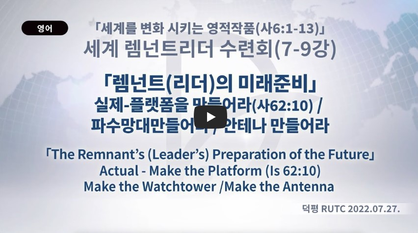2023년 7월 14일 (금) 분류 2022- 세계 렘넌트 리더수련회 제목 3강의: 실제 플랫폼+파수망대+안테나를 만들어라. 성경 이사야 62:6-12 일시/장소 2022년 7월 27일-28일, 덕평RUTC 설교 류광수 목사 (녹취정