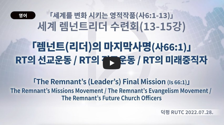 2023년 7월 19일 (수) 분류 2022- 세계 렘넌트 리더수련회 제목 5강: 렘넌트(리더)의 마지막 사명 → 렘넌트의 선교운동+전도운동+미래 중직자 성경 이사야 66:1 일시/장소 2022년 7월 27일-28dlf, 덕평RUTC