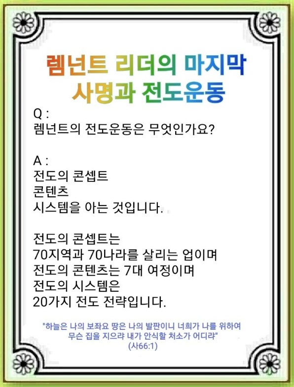 '렘넌트의 선교운동'을 하려면 '렘넌트의 전도운동'이 무엇인지 알아야 합니다. 전도에는 콘셉트, 콘텐츠, 시스템이 있습니다. 첫째, 성경에 보면 12지파와 12사도, 70인 장로와 70인 제자가 나옵니다. 앞으로 렘넌트의 업은 70지역과 70 나라를 움직일 수 있어야 됩니다. 이것이 전도의 '콘셉트'입니다. 둘째, 전도의 '콘텐츠'는 '7대 여정'입니다. 이것은 성삼위 하나님께서 함께하시는 비밀과 혼자서도 살아남는 10가지 비밀, 확실한 발판 10가지와 5가지확신, 그리고 평생의 답인 62가지 삶을 가지고 여정을 가는 것입니다. 결국우리의 마지막 여정은 교회, 예배, 기도입니다. 이것이 전부입니다. 마지막으로 전도의 '시스템'입니다. 그것은 다락방 전도 20가지 전략입니다. 전도의콘셉트, 콘텐츠, 시스템를 알아야 선교가 가능합니다. 이 속에 렘넌트의 업이들어 있어야 합니다. 전도, 선교는 세 가지 운동입니다.