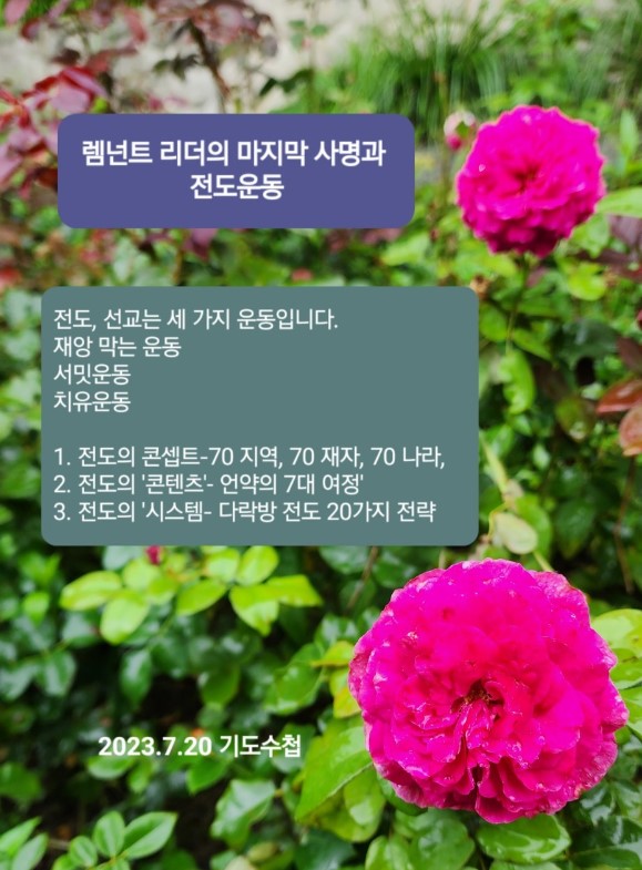 [언약 기도] 하나님께 감사드립니다. 앞으로 렘넌트의 업이 70 지역과 70나라 살리는 것에 쓰임 받게 하옵소서. 7대 여정을 가게 하옵소서. 다락방 20전도 전략 속에 오늘의 삶이 있게 하옵소서. 렘넌트 통해 재앙 막는 운동, 서밋운동, 치유운동이 전 세계 속에서 일어나게 하옵소서. 렘넌트의 전도운동이 일어나기를 간절히 소원합니다. 예수 그리스도 이름으로 기도하옵나이다. 아멘.