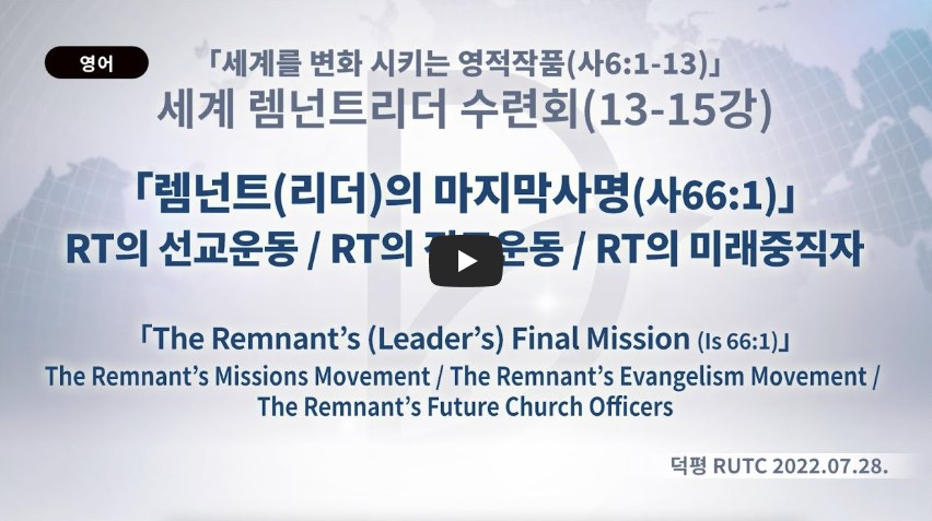2023년 7월 20일 (목) 분류 2022- 세계 렘넌트 리더수련회 제목 5강: 렘넌트(리더)의 마지막 사명 → 렘넌트의 선교운동+전도운동+미래 중직자 성경 이사야 66:1 일시/장소 2022년 7월 27일-28dlf, 덕평RUTC