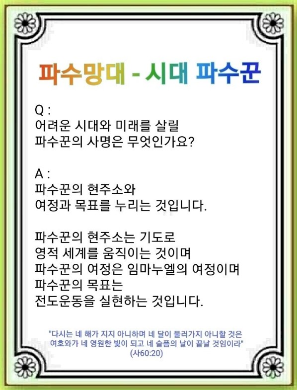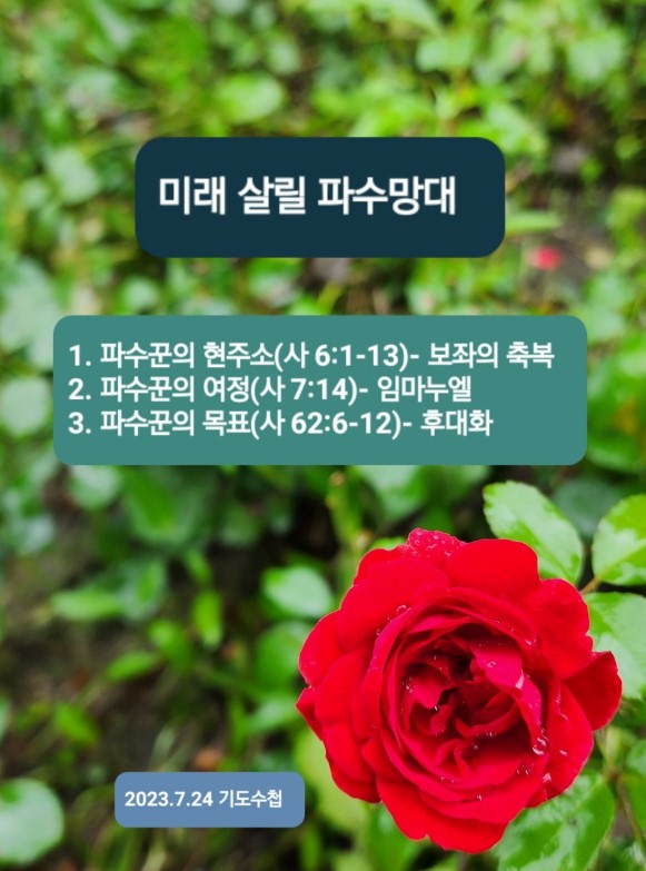 파수꾼의 여정은 임마누엘의 여정입니다.(사 7:14) 하나님이 우리와 교회, 학업에 함께하십니다. 또 여호와의 말씀은 영원하며, 하나님이 아닌 우상에 속지 말고, 오직 여호와를 앙망하라고 하셨습니다.(사 40장) 사람이 할 수 없는 일을 펼칠 것이고(사 43장), 여호와의 영광이 네 위에 임하였으니 일어나서 빛을 발하라고 하셨습니다.(사 60장) 우리는 믿고 기도만 하면 됩니다.