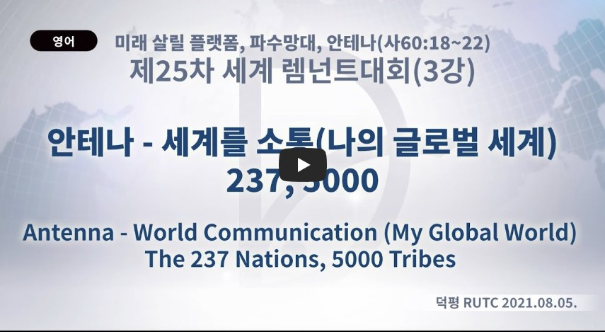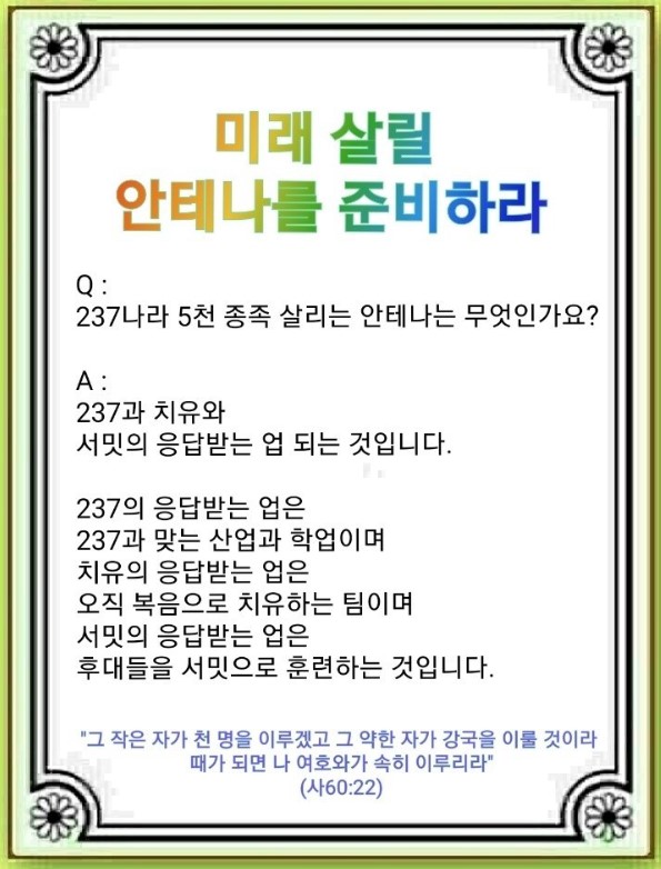 렘넌트는 237, 5천 종족 살릴 준비를 해야 합니다. 세계에 나타난 흑암 문제 때문입니다. 이것을 모르면 노예, 포로, 속국, 유랑민이 되어야 됩니다. 심지어 이것이 제도화되었습니다. 그러나 237, 5천 종족이라는 말을 알아듣는 순간 갈 필요 없이 정복하게 됩니다. 하나님이 렘넌트에게 237, 5천 종족 할 수 있는 절대 계획을 주셨습니다. 그것이 남은 자(복음 회복), 남는 자(능력 회복), 남을 자(문화 회복), 남길 자의(후대 회복) 축복입니다. 237, 5천 종족이 소통되는 열쇠가 WIO의 축복과 OURS의 응답, 5가지 정체성의 누림입니다. 우리의 현주소는 보좌입니다. 남은 자, 순례자, 정복자의 여정을 따라 플랫폼, 파수 망대,안테나를 준비하는 것입니다. 이때 홀리 메이슨, 홀리 리더, 홀리 디아스포라의 힘을 가지게 됩니다. 그리고 올바른 선교와 전도를 아는 중직자로 준비해야 됩니다. 이때 237, 5천 종족을 살리는 세 가지 안테나가 세워집니다.