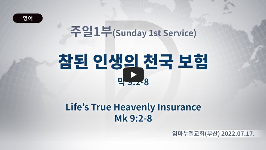 인터넷총국 (홈페이지 http://data.rutc.com) 후원: (국민은행) 856701-04-233309 (사)세계복음화전도협회 인터넷총국 분류 주일예배 설교- 주일1부 제목 참된 인생의 천국 보험 성경 마가복음 9:2-8 일시/장
