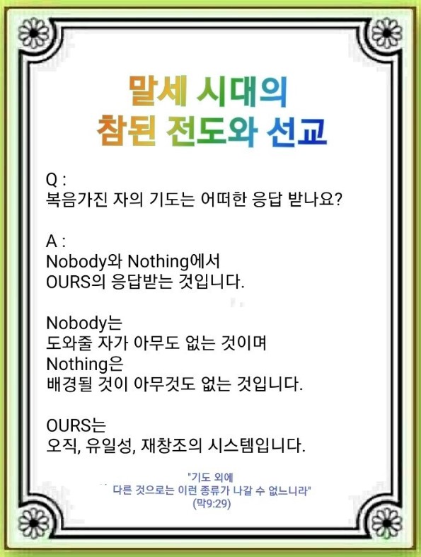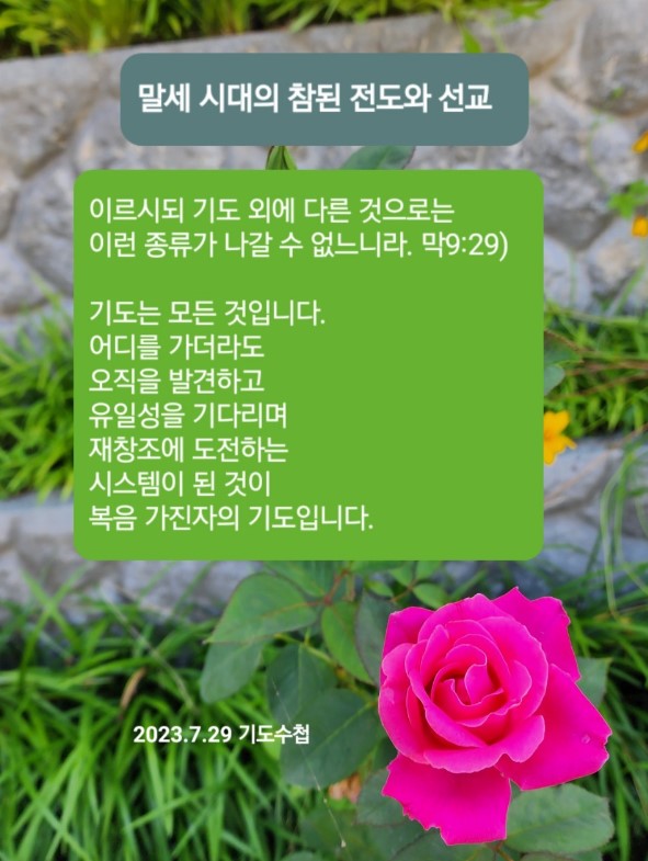“기도 외에는 이런 유가 나갈 수 없느니라.”(막 9:29) 어디를 가더라도 오직을 발견하고 유일성을 기다리며 재창조에 도전하는 시스템이 된 것이 복음 가진자의 기도입니다. 믿는 자에게 능치 못함이 없는 그리스도가 나의 주인이 되고, 그 능력을 누리고 전달하는 것이 기도입니다.