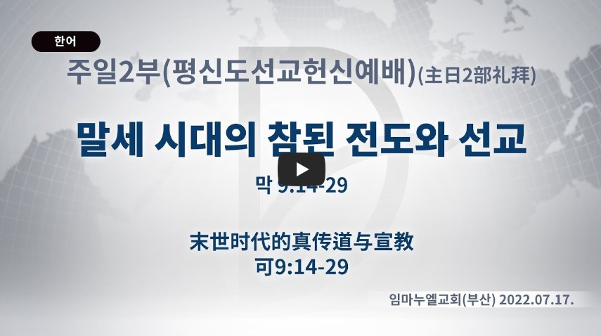 인터넷총국 (홈페이지 http://data.rutc.com) 후원: (국민은행) 856701-04-233309 (사)세계복음화전도협회 인터넷총국 분류 주일예배 설교- 주일2부 제목 (평신도선교헌신) 말세 시대의 참된 전도와 선교 성