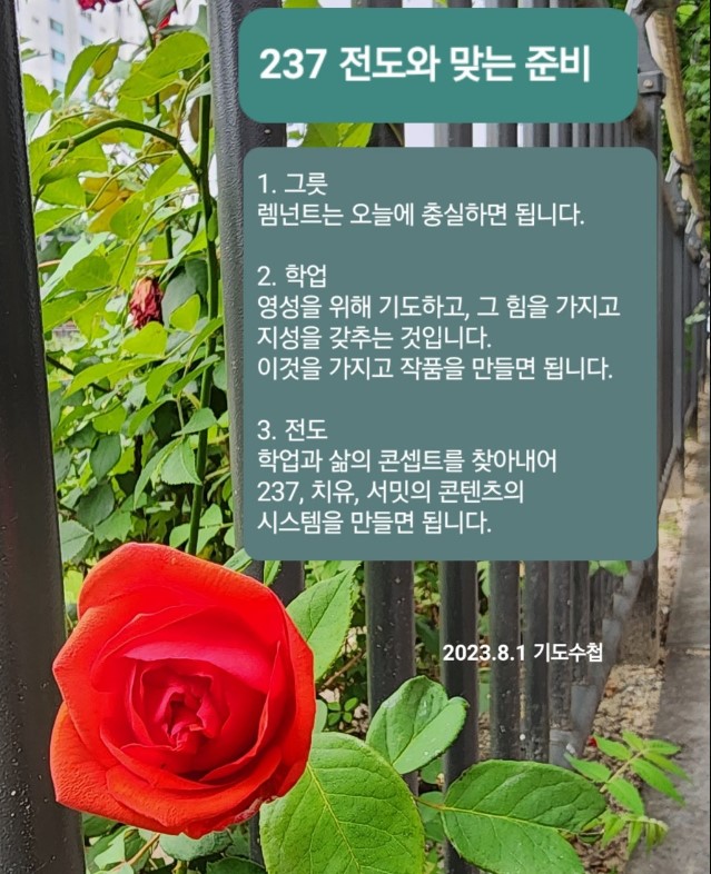 전도할 때 그냥 하면 안 됩니다. 학업과 삶의 콘셉트를 인생 속에서 찾아내는 것이 가장 중요합니다. 렘넌트의 콘셉트는 237, 치유, 서밋입니다. 여기에 따라 콘텐츠가 나옵니다. 이때부터 시스템을 만들면 됩니다. 시스템은 현장에 맞는 미디어로 해야 합니다. 렘넌트의 학업은 이렇게 쓰임받는 것입니다. 앞으로 완전 미디어 시대가 옵니다. 렘넌트는 그 시대의 주역입니다. 여기에 맞는 콘셉트, 콘텐츠, 시스템을 가지고 미디어 시대를 준비해야 됩니다. 2030~2080시대는 완전히 다른 시대입니다. 시대를 내다보고 세계복음화를 준비하고, 237과 맞는 학업을 준비해야 됩니다. 렘넌트는 아침에 눈 떴을 때, 잠자기 전 5분만 기도해도 시대를 보게 됩니다.