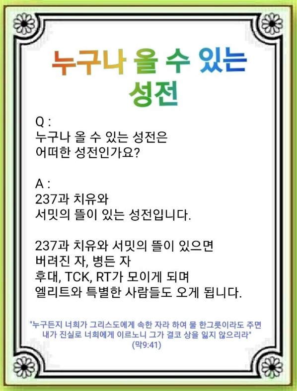 우리는 누구나 올 수 있는 성전을 준비해야 합니다. 귀신 들렸거나 영적 문제가 있는 사람도 걱정할 필요가 없습니다. 24 하나님의 응답 속으로 들어가는 것입니다. 누구든지 예수 이름으로 구원받으면 냉수 한 그릇도 상을 잃지 않는다고 했습니다. 그래서 누구든지 올 수 있는 교회를 만들어야 합니다. 성전을 준비할 때 가장 중요한 것은 나 자신부터 응답받는 것입니다. 예수 그리스도로 구원받은 자가 모여서 하나님의 축복을 누리는 곳이 성전입니다. 보좌의 축복을 실제로 이 땅에서 누릴 수 있도록 하는 것이 교회, 성전입니다. 그래서 교회는 24·25·영원의 응답을 받을 수 있어야 합니다. 우리는 성전 준비를 어떻게 해야 할까요?