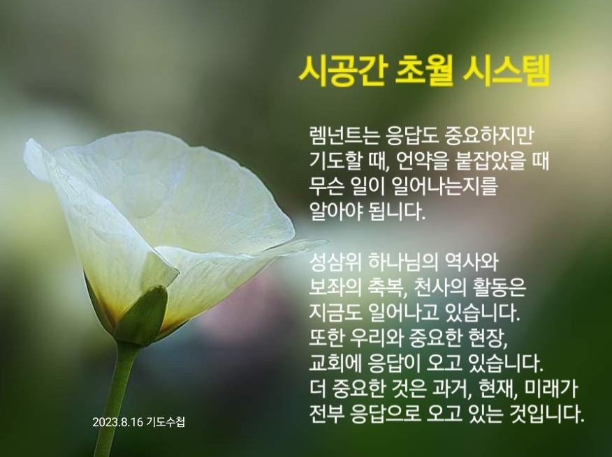 렘넌트는 시공간을 초월하는 시스템을 갖추어야 합니다. 렘넌트는 응답도 중요하지만 기도할 때, 언약을 붙잡았을 때 무슨 일이 일어나는지를 알아야 됩니다. 성삼위 하나님의 역사와 보좌의 축복, 천사의 활동은 지금도 일어나고 있습니다. 또한 우리와 중요한 현장, 교회에 응답이 오고 있습니다. 더 중요한 것은 과거, 현재, 미래가 전부 응답으로 오고 있는 것입니다. 그래서 렘넌트는 세 가지를 해야 됩니다.