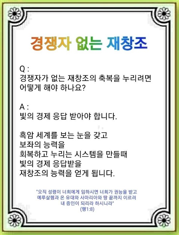 우리는 경쟁자가 없는 재창조의 축복을 누려야 됩니다. 불신자들은 무조건 돈만 벌면 된다고 생각합니다. 이것은 혼란 경제입니다. 그런데 자세히 보면 이념 경제입니다. 교회를 포함한 종교단체는 3단체를 따라가는 노예 경제입니다. 이때 렘넌트의 경제는 빛의 경제, 재창조의 경제여야 합니다. 이것을 렘넌트에게 바르게 가르쳐 주려면 세 가지를 봐야 합니다.