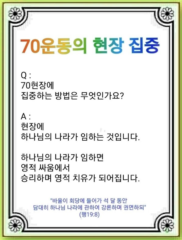 이제 우리는 70현장에 집중해야 합니다. 아무리 답을 가지고 있어도 현장을 놓치면 아무 소용이 없습니다. 다른 사람들이 현장에 신경쓰지 않더라도 우리는 하나님께서 하시는 것에 집중해야 합니다.