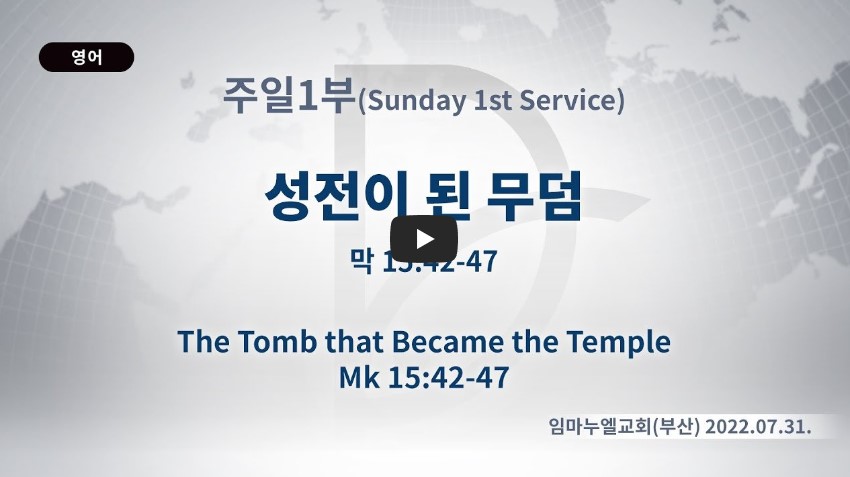 인터넷총국 (홈페이지 http://data.rutc.com) 후원: (국민은행) 856701-04-233309 (사)세계복음화전도협회 인터넷총국 분류 주일예배 설교- 주일1부 제목 성전이 된 무덤 성경 마가복음 15:42-47 일시/장소 2022