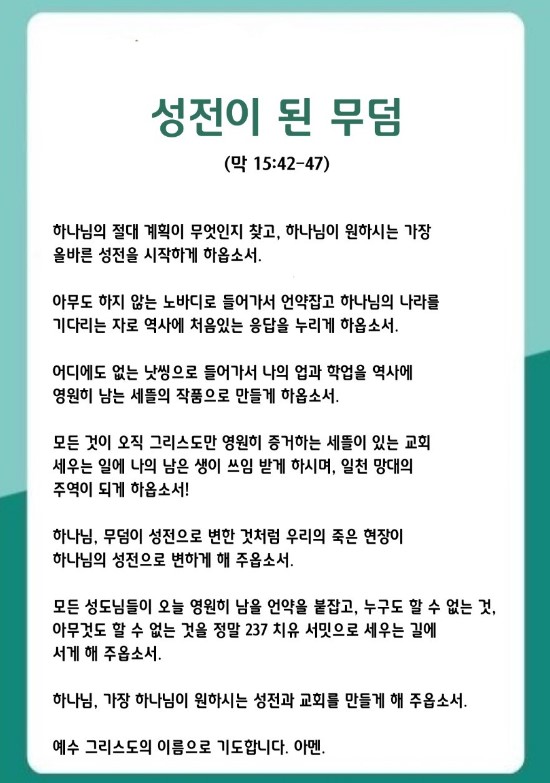 [언약 기도] 하나님께 감사드립니다. 무덤이 성전으로 변한 것처럼 우리의 죽은 현장이 하나님의 성전으로 변하게 해 주옵소서. 모든 성도님들이 오늘 영원히 남을 언약을 붙잡게 해 주옵소서. 누구도 할 수 없는 것, 아무것도 할 수 없는 것을 정말 237 치유 서밋으로 세우는 길에 서게 해 주옵소서. 예수 그리스도 이름으로 기도하옵나이다. 아멘.
