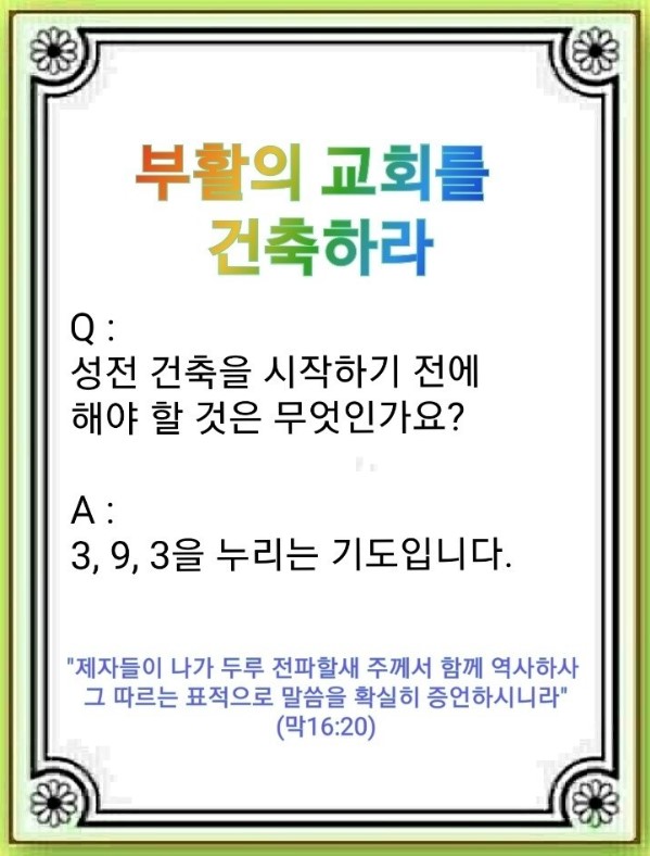 성전 건축을 시작하기 전에 기도에 대해서 알아야 합니다. 보좌의 축복을 누려야 공중권세 잡은 자를 이길 수 있고, 하나님 나라와 그 일을 이룰 수 있습니다. 예배가 살아나면 보좌의 능력을 누리는 24 기도가 됩니다. 이때부터 근원적인 힘이 회복되기 때문에 저절로 치유가 됩니다. 그러면 25, 영원이 오는 것입니다. 하나님이 제1, 2, 3 성전을 없애신 이유는 세 가지 뜰이 없었기 때문입니다. 영적인 축복은 누리지 않고 육신적인 것만 계속한 것입니다. 이때 그리스도께서 부활하셔서 중요한 메시지를 주셨습니다. 그래서 우리는 부활의 교회를 지어야 됩니다. 우리는 회복해야 할 것이 있습니다. 첫째, 세가지 뜰, 즉 24 시설입니다. 둘째, 다민족, 치유 대상자, 렘넌트들이 주역이되는 시설입니다. 셋째, 24 시스템입니다. 다민족, 병든 자, 렘넌트들이 와서 힘을 얻는 교회, 망대입니다. 그렇다면 부활의 교회는 무엇일까요?