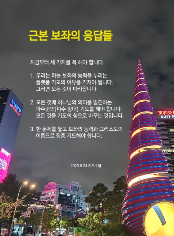 렘넌트는 지금부터 세 가지를 꼭 해야 합니다. 첫째, 우리는 하늘 보좌의 능력을 누리는 플랫폼 기도의 여유를 가져야 됩니다. 그러면 모든 것이 따라오게 됩니다. 둘째, 모든 것에 하나님의 의미를 발견하는 파수꾼의(파수 망대) 기도를 해야 합니다. 모든 것을 기도의 힘으로 바꾸는 것입니다. 셋째, 한 문제를 놓고 보좌의 능력과 그리스도의 이름으로 집중 기도해야 합니다. 예수께서 감람산에서 제자들을 모아 놓고 하신 40일 집중 기도를 체험해 보시기 바랍니다. 이때 근본적인 보좌의 응답이 따라옵니다. 이 응답의 주인이 예수 그리스도입니다. 예수께서는 이스라엘이 보좌의 응답을 놓치고 속국되었을 때 태어나셨습니다. 예수는 과거의 영적 문제를 해결하신 영세 전 그리스도이시고(창 3:15, 출 3:18), 사람의 몸을 입고 오신 그리스도이십니다. 기도에 응답하시는 부활하신 그리스도시요, 재림 주로 서실 그리스도입니다. 이 분이 우리의 배경이 되십니다.