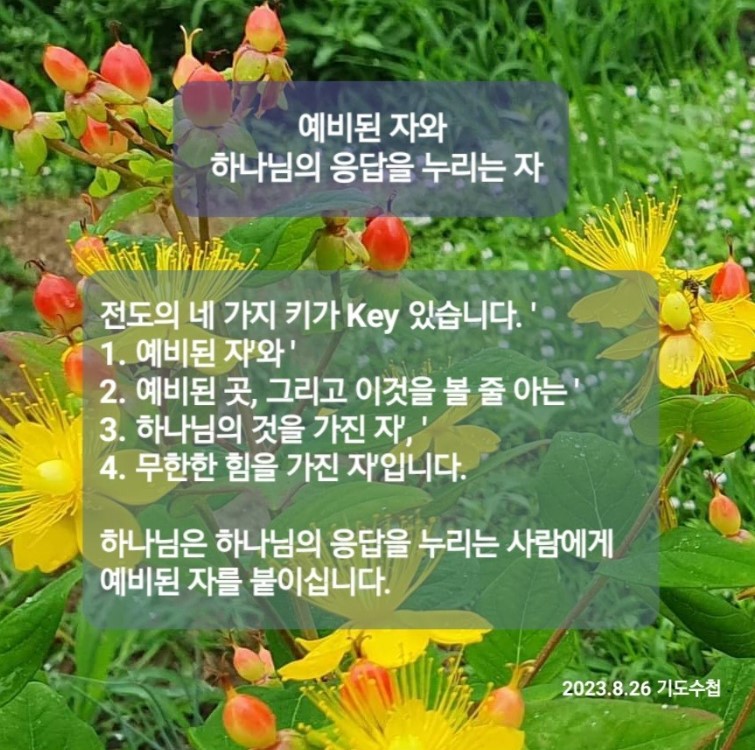 전도의 네 가지 키가 Key 있습니다. '예비된 자'와 '예비된 곳, 그리고 이것을 볼 줄 아는 '하나님의 것을 가진 자', '무한한 힘을 가진 자'입니다. 하나님은 하나님의 응답을 누리는 사람에게 예비된 자를 붙이십니다. 그러면 우리가 누려야 할 응답이 무엇일까요? 예수께서 12사도와 70인을 세우셨습니다. 그리고 이들에게 그리스도께서 모든 것을 끝낸 갈보리산 사건을 체험시키셨습니다.(요 19:30) 또한 감람산에 모아 놓고 하나님 나라의 일과 성령 충만을 두고 40일 동안 집중하게 하셨습니다.(행 1:3, 8) 이 언약을 붙잡고 마가 다락방에 모인 제자들은 굉장한 능력을 체험하고 완전히 답이 났습니다.행 2:1-47 나와 교회에 갈보리산, 감람산, 마가 다락방이 세팅되었을 때 하나님께서 예비된 자를 붙이십니다.
