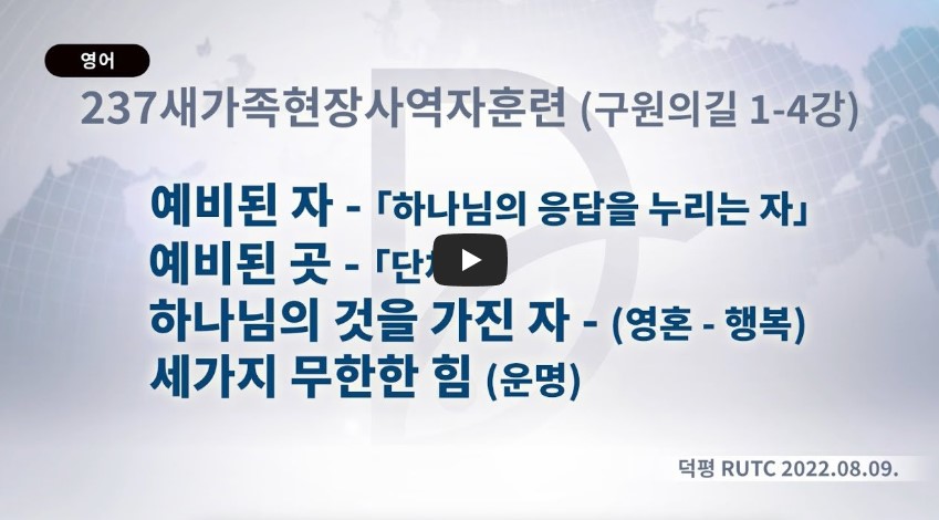 인터넷총국 (홈페이지 http://data.rutc.com) 후원: (국민은행) 856701-04-233309 (사)세계복음화전도협회 인터넷총국 분류 2022- 새가족/현자사역자 훈련- (교재) 구원의 길 제목 (교재-구원의 길 시작) 1강: