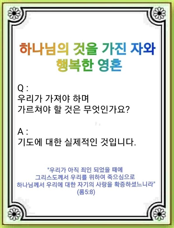 우리가 죄인 되었을 때 하나님이 그리스도를 보내사 길을 여셨습니다. 이 사실을 믿으면 됩니다. 그러면 영적 호적이 바뀝니다.(요 5:24) 하나님 자녀 된 신분과 권세가 주어집니다.(요 1:12) 믿고 입으로 시인할 때 구원과 응답의 열매가 일어납니다.(롬 10:9-10) 이 구원을 지금 받아야 됩니다.