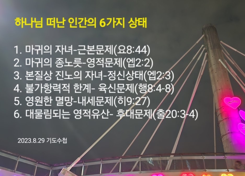그런데 사탄이 '나'라는 것을 가지고 인간을 무너뜨렸습니다.(창 3:4-5) '나의 것' 때문에 완전히 사탄에게 잡혀버렸습니다.(창 6:4-5) 하나님 없이 나를 나타내려고 하다가 실패했습니다.(창 11:1-8) 그 결과 하나님 떠난 6가지 상태 아래 놓였습니다. 문제는 하나님 자녀조차도 이 속임수에 걸려든다는 것입니다. 그래서 하나님께서 창 3:15, 6:14, 12:1-3 언약을 주신 것입니다.