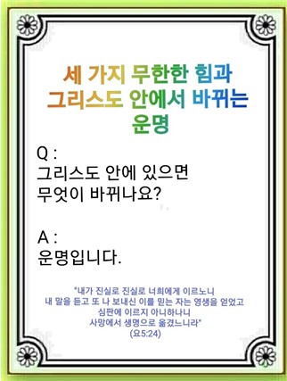 그리스도 안에 있다는 것은 운명이 바뀌었다는 것입니다. 이제 세 가지 무한한 힘을 얻고 전달하기만 하면 됩니다. 이를 위해 첫째, 영적 세계와 기도의 3 비밀을(아침·낮·밤 기도) 얼마나 누리느냐가 중요합니다. 둘째, 삶 속에서 무한한 힘이 되는 위드·임마누엘·원니스를 누리는 것입니다. 마지막으로, 이때 그리스도 안에서 무한한 증거인 오직·유일성·재창조의 응답이 나오게 됩니다. 이 응답을 누리는 시스템을 만들면 됩니다. 그러므로 갈보리산(요 19:30), 감람산( 행 1:3, 8, 40일), 마가 다락방(행 2:1-47) 축복을 누리는 시스템을 빨리 만들어야 합니다.