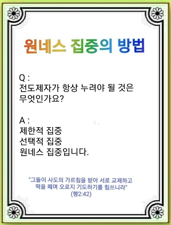 하나님과 나와 모든 것 속에 후대가 원니스 되어야 됩니다. 진짜 응답의 흐름은 제1, 2, 3, 4, 5 RUTC운동으로 갑니다. 이 흐름을 안 중직자들이 회당, 서원, 저자로 파고들었습니다.(행 17:1, 18:4, 19:8) 2030~2080년도에 살아갈 렘넌트들에게 원니스 집중의 축복을 알게 해야 합니다.