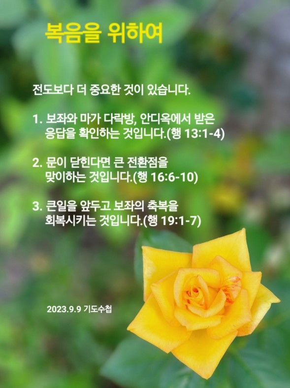 전도자가 따라가야 하는 길에 전도보다 더 중요한 것이 있습니다. 보좌와 마가 다락방, 안디옥에서 받은 응답을 확인하는 것입니다.(행 13:1-4) 문이 닫힌다면 큰 전환점을 맞이하는 것입니다.(행 16:6-10) 큰일을 앞두고 보좌의 축복을 회복시키는 것입니다.(행 19:1-7)
